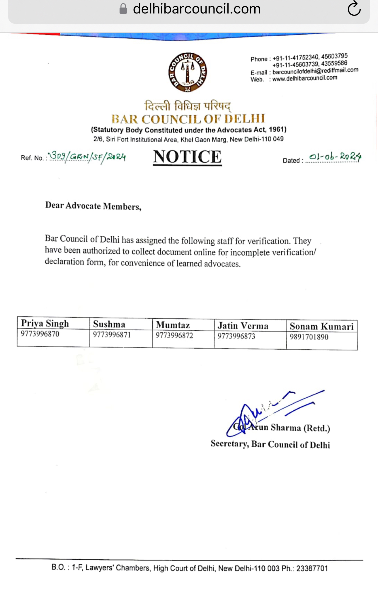 "Dear Advocate, The Bar Council of Delhi has designated the following staff members for verification purposes. They are authorized to collect documents online for any incomplete verification or declaration forms, to facilitate convenience for our esteemed advocates." Download Link: Click here to download Official BCD Helpline Number The Bar Council of Delhi is a statutory body responsible for regulating the legal profession and legal education in the state of Delhi, India. It operates under the Advocates Act, 1961, which governs the conduct of advocates, their admission to the bar, and their practice in India. Key Functions of the Bar Council of Delhi: 1. Regulation and Admission: - It grants licenses to law graduates to practice as advocates in Delhi after they pass the All India Bar Examination (AIBE). - It maintains a roll of advocates who are entitled to practice in the state. 2. Disciplinary Authority: - It investigates and addresses complaints of professional misconduct against advocates. - It has the power to suspend or disbar advocates found guilty of misconduct. 3. Promotion of Legal Education: - It sets standards for legal education and ensures that institutions providing legal education in Delhi comply with these standards. - It organizes seminars, workshops, and continuing legal education programs for advocates. 4. Welfare Activities: - It provides welfare schemes for the benefit of advocates, such as financial assistance, insurance schemes, and medical benefits. - It supports the professional development and well-being of its members. 5. Representation: - It represents the interests of advocates in various forums, including interactions with the judiciary, government, and other stakeholders in the legal system. - It plays a role in law reform and policy-making by providing inputs and suggestions to the government. 6. Election of Members: - The Bar Council of Delhi is composed of elected members from among the advocates practicing in Delhi. These members are responsible for the governance and administration of the council's activities. The Bar Council of Delhi plays a crucial role in maintaining the standards of the legal profession in the state and ensuring that advocates adhere to ethical practices while serving the public and the justice system.
